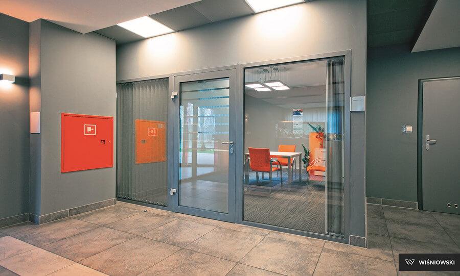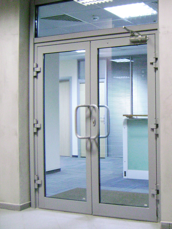 От качества заполнителя зависит, насколько эффективно преграда будет препятствовать распространению высоких температур. Материал должен быть негорючим и стойким к температурным воздействиям. В комплектацию противопожарной алюминиевой двери также входят уплотнители, ручки, замки и иные элементы фурнитуры. Дополнительные фурнитурные детали: доводчики, отбойные пластины, пороги разных типов.