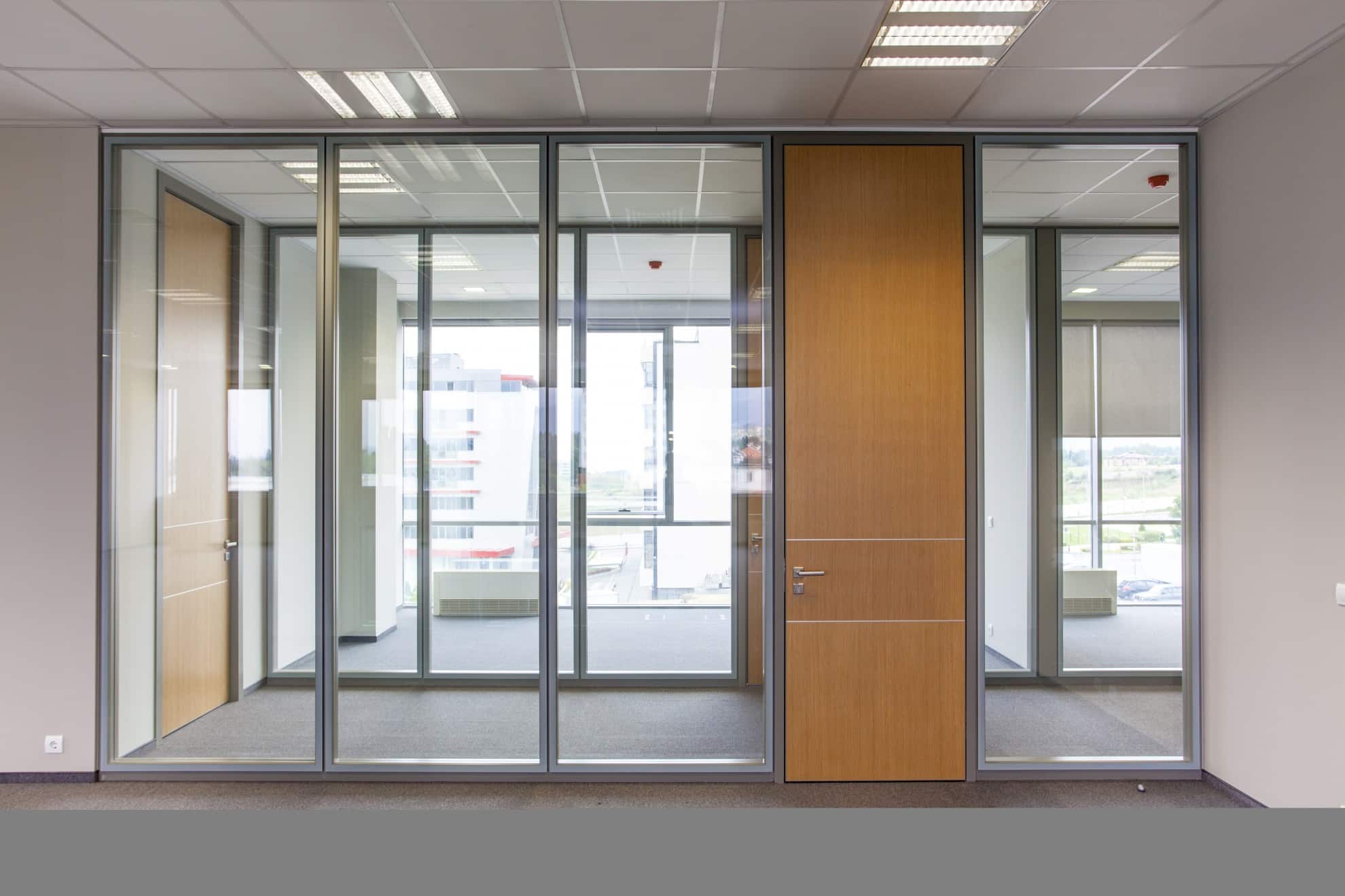 Противопожарные перегородки для электрощитовых комнат могут изготавливаться как в полностью остекленном варианте, так и в частично остекленном исполнении. Основное предназначение таких конструкций — это разделение общего помещения на несколько отдельных рабочих зон. При этом преследуется несколько целей: